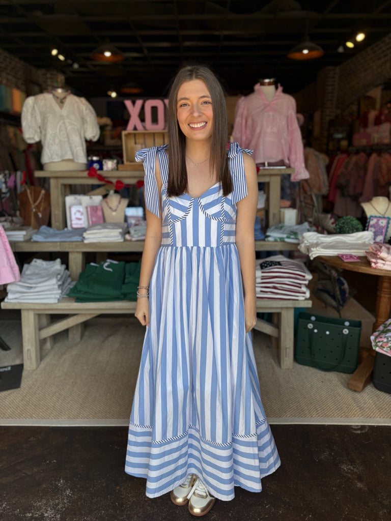 Elevate your wardrobe with the Kenya Dress, a stunning maxi silhouette that effortlessly transitions from day to night. Featuring delicate shoulder straps that tie for an adjustable, personalized fit, this striped design offers timeless appeal with modern versatility. Choose between serene light blue or rich green to match your mood and style. The flowing maxi length provides elegant coverage while the stripe pattern adds visual interest and dimension. Perfect for warm-weather occasions, casual outings, or dressed-up events, the Kenya Dress is the go-to piece that works as hard as you do.