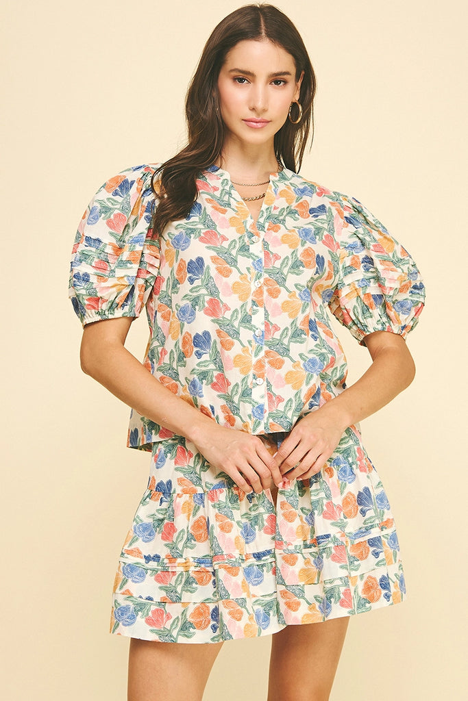 Elevate your everyday wardrobe with this versatile cream multi puff sleeve top. The flattering V-neck and button-down front offer effortless styling options, while the distinctive balloon short sleeves with tucked details add a modern, fashion-forward touch. Perfect for layering or wearing solo, this piece transitions seamlessly from casual weekends to polished workdays. The thoughtful sleeve construction creates visual interest and dimension, making it a standout addition to any closet that values both comfort and contemporary style.