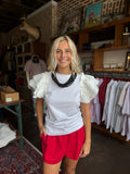 The Flutter Ruffle Sleeve Top adds a playful touch to your wardrobe with its elegant ruffle sleeves. Its versatile design effortlessly pairs with fun shorts or your favorite jeans, making it perfect for both casual outings and stylish gatherings.