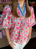 Introducing the Elora Top—your new go-to for effortless charm! This delightful pink floral beauty features adorable puff sleeves that add a touch of whimsy to any outfit. Perfect for spring strolls, casual hangouts, or whenever you want to feel a little extra fabulous. The short sleeves keep things breezy and comfortable, while the cheerful floral print brings instant joy to your wardrobe. Whether you're dressing it up with a skirt or keeping it casual with jeans, the Elora Top is ready to make you smile.