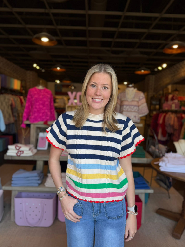 Stripes never go out of style—and this short sleeve knit top proves it. Crafted from soft, breathable knit fabric, it's the perfect layering piece or standalone essential for effortless everyday wear. The classic striped pattern adds visual interest without demanding much thought, while the relaxed fit keeps you comfortable from morning coffee to evening plans. Throw it on with jeans, shorts, or a skirt and call it a day. Simple, versatile, and always a win.