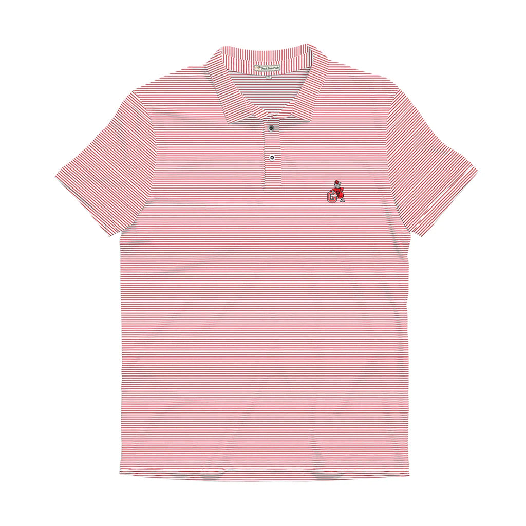 The Peach State Pride Red & White Beech Stripe Polo features the University of Georgia's Leaning Dawg left chest embroidery. Perfect for UGA football gamedays!