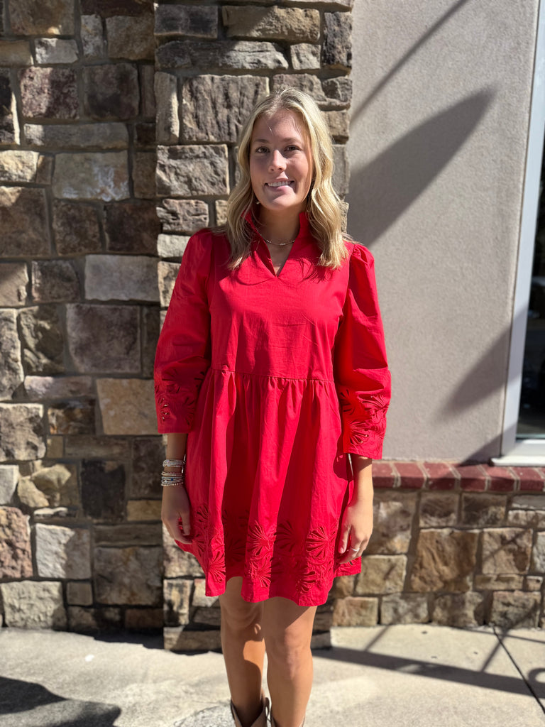 The Carly Dress is the perfect addition to any wardrobe, seamlessly transitioning from summer to fall. Its eyelet bell sleeves and bottom trim add a touch of elegance and style. Whether you're headed to a game or a night out, this dress has you covered in both comfort and fashion.