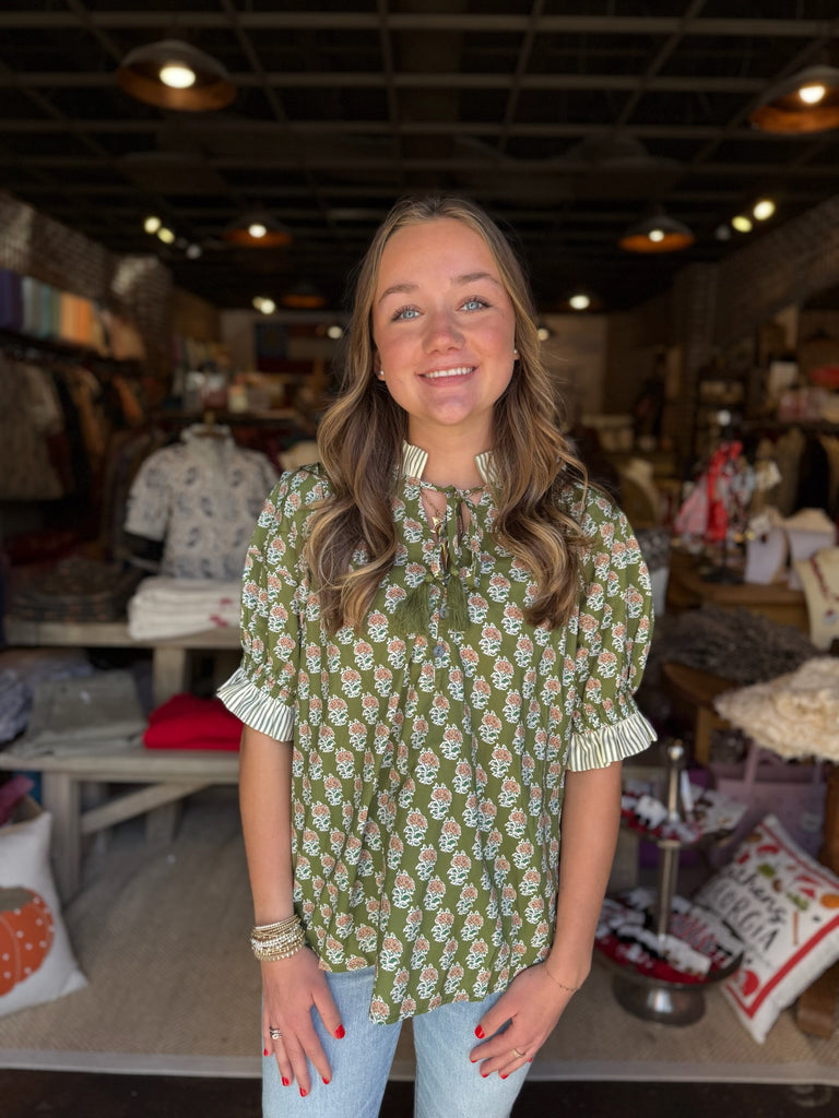 Introducing the Amelie Top—your new go-to for effortless charm! This delightful piece features a vibrant green floral pattern that brings nature's beauty straight to your wardrobe. Playful ruffle detailing adds movement and personality, perfect for twirling through your day. Whether you're dressing up for brunch or keeping it casual, this top strikes the ideal balance between feminine flair and everyday wearability. A true closet essential that makes getting dressed fun!