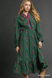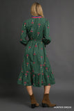 The Umgee Finley Dress is a whimsical wardrobe essential that brings effortless charm to any occasion. Featuring delicate embroidery and a flattering V-neckline adorned with contrast ruffle trim, this dress exudes vintage-inspired elegance. Long balloon sleeves with ruffled elastic cuffs add a playful touch, while the smocked elastic waist ensures a comfortable, adjustable fit. The tiered midi-length hemline creates beautiful movement and dimension. Perfect for those who love romantic, statement-making pieces with personality and flair.