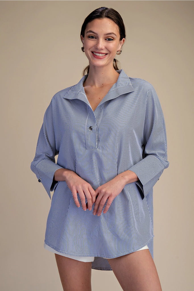 Effortless style meets comfort in this standout dolman sleeve shirt. The relaxed, flowing sleeves create an easy silhouette perfect for layering or wearing solo, while the crisp stand collar adds a touch of polish to your everyday look. Whether you're heading to brunch or running errands, this versatile piece transitions seamlessly from casual to put-together. Soft fabric and a flattering cut make it a wardrobe essential that feels as good as it looks.