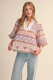 Elevate your everyday style with this charming &merci exclusive V-neck top, featuring a playful bubble sleeve design that adds instant personality. The contrast ruffled neckline and elbow-length sleeves with coordinating cuffs create a polished yet relaxed silhouette perfect for effortless dressing. Crafted with a comfortable relaxed fit and lined for smooth wear, this sand multi print piece transitions seamlessly from casual outings to weekend adventures. A wardrobe essential that brings both comfort and flair to your collection.