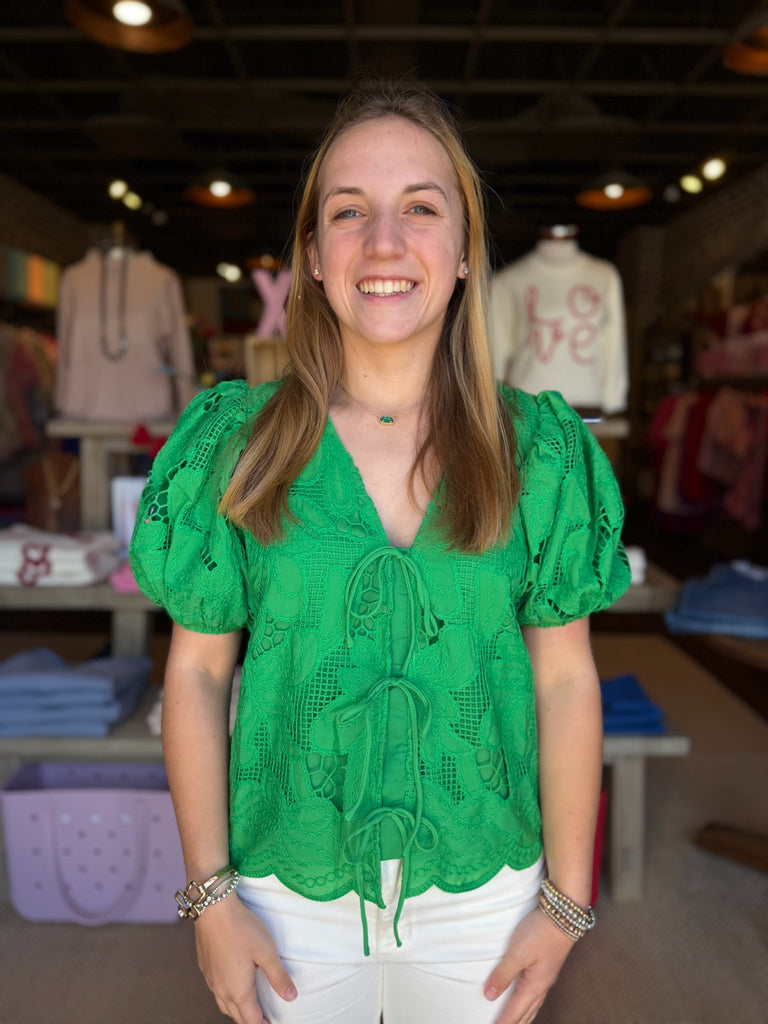 Breezy and adorable, this Kelly Green eyelet top is your new warm-weather essential. The charming tie front and puff sleeves deliver instant cuteness, while the scallop edge trim adds a playful finishing touch. Perfect for effortless, feel-good style when the sun's shining.