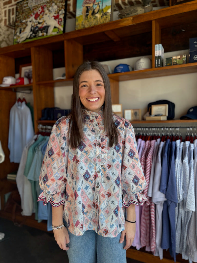 Elevate your everyday wardrobe with the Lilian Top, a versatile long sleeve button-up designed for effortless style. The classic pattern adds visual interest while the structured fit flatters all body types. Perfect for layering or wearing solo, this piece transitions seamlessly from office to weekend.