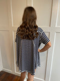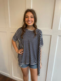 "Take on the day in style with our Oversized Navy Stripe Top! Featuring an oversized fit, this top is perfect for dressing up or down. Get ready to turn heads and make a statement with this versatile piece. Who said fashion can't be comfortable?!"