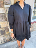 The Carly Dress is the perfect addition to any wardrobe, seamlessly transitioning from summer to fall. Its eyelet bell sleeves and bottom trim add a touch of elegance and style. Whether you're headed to a game or a night out, this dress has you covered in both comfort and fashion.