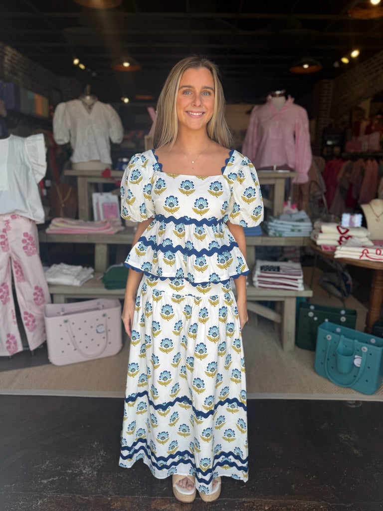 A floral-print peplum top featuring layered ruffle tiers trimmed with bold contrast ric-rac detailing. Designed with puff sleeves and a square neckline with scalloped edging. Finished with a back concealed zipper closure.